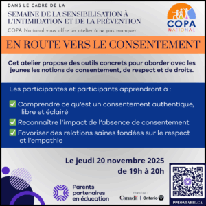 Dans le cadre de la Semaine de la sensibilisation à l’intimidation et de la prévention, COPA National vous invite à un atelier interactif qui propose des outils concrets pour aborder avec les jeunes les notions de consentement, de respect et d’empathie. À travers des exemples pratiques et des discussions guidées, les participantes et participants apprendront […]