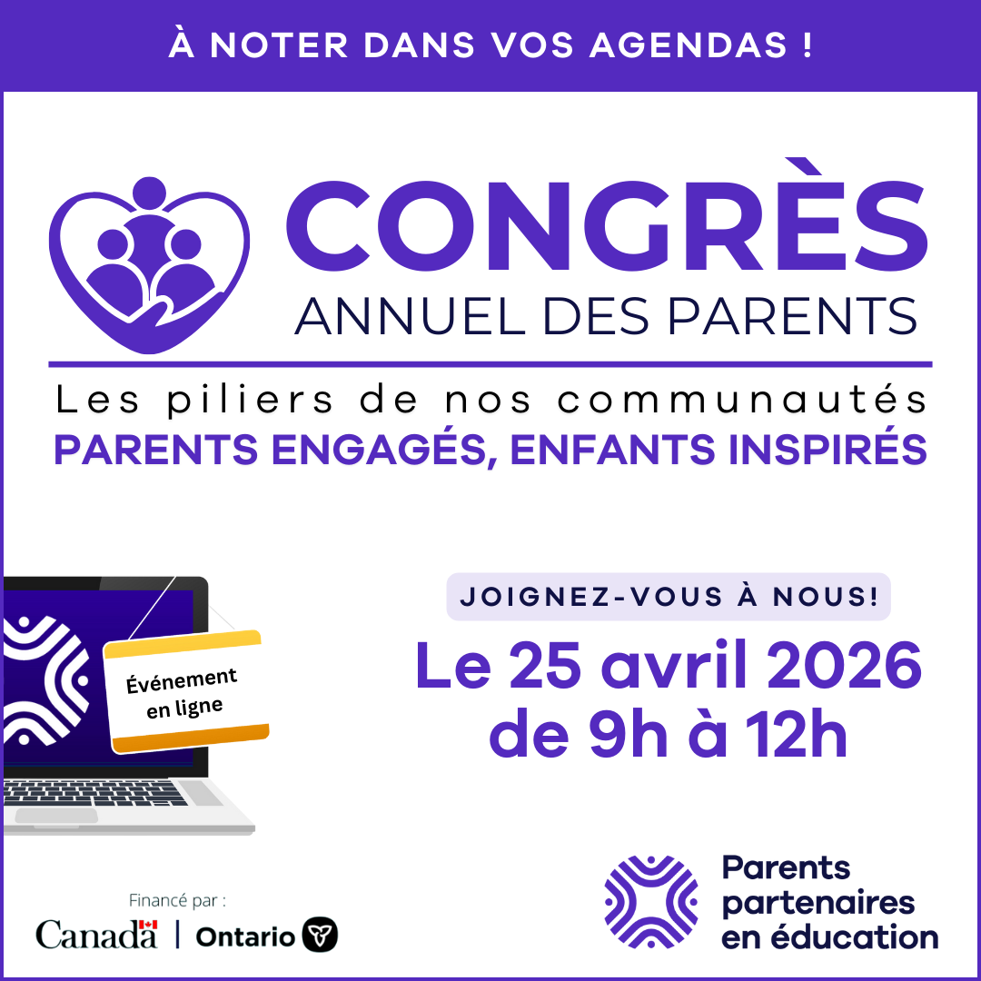 Parents partenaires en éducation vous invite à son Congrès annuel des parents, qui se tiendra en ligne le samedi 25 avril 2026, de 9 h à 12 h.