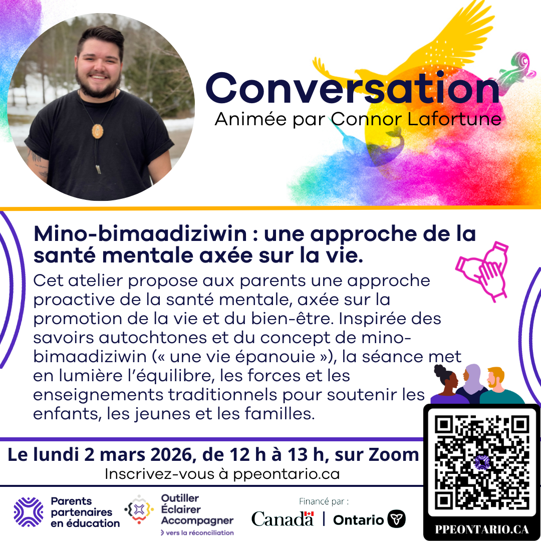 Atelier pour parents sur une approche proactive de la santé mentale, inspirée du mino-bimaadiziwin et des savoirs autochtones.