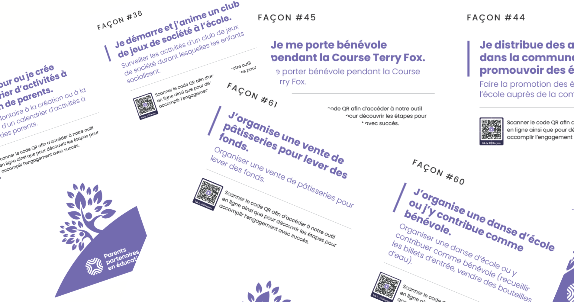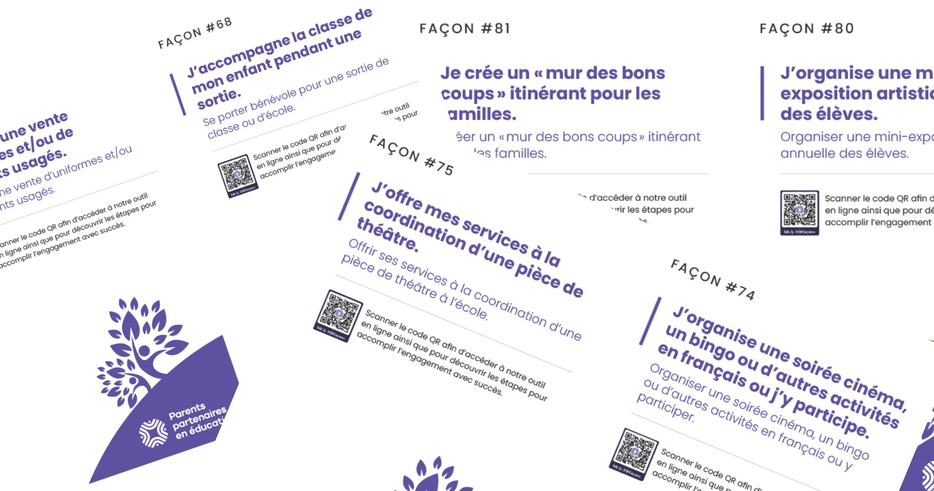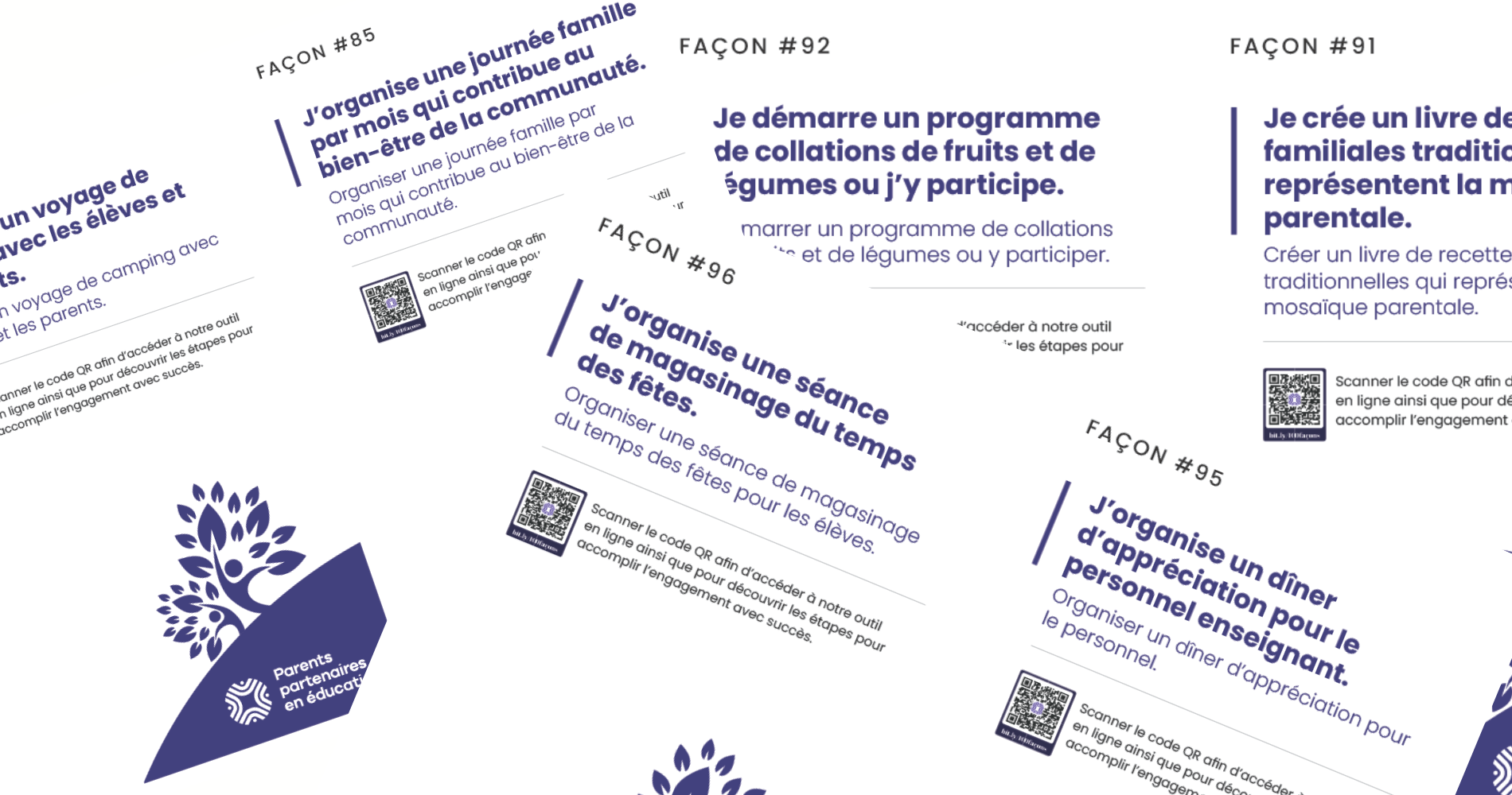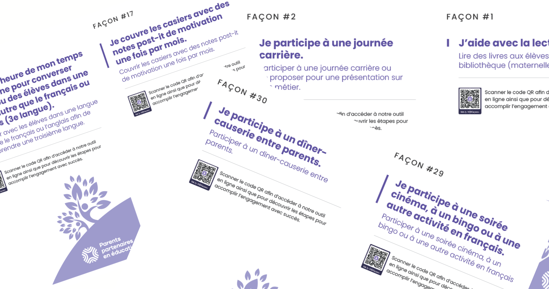 Les 100 façons sont à la fois un outil d’inspiration pour les familles et un support concret pour encourager l’engagement parental dans les écoles et les communautés scolaires francophones.
